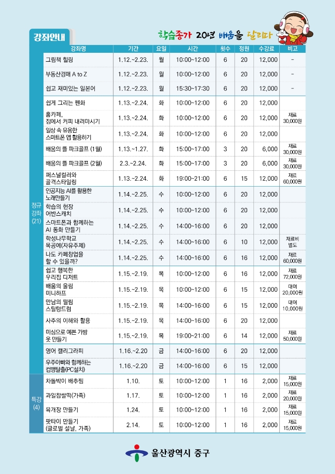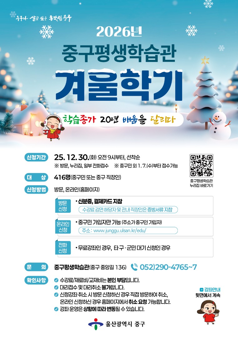2026중구 평생학습관 겨울학기강좌 수강생 모집 안내